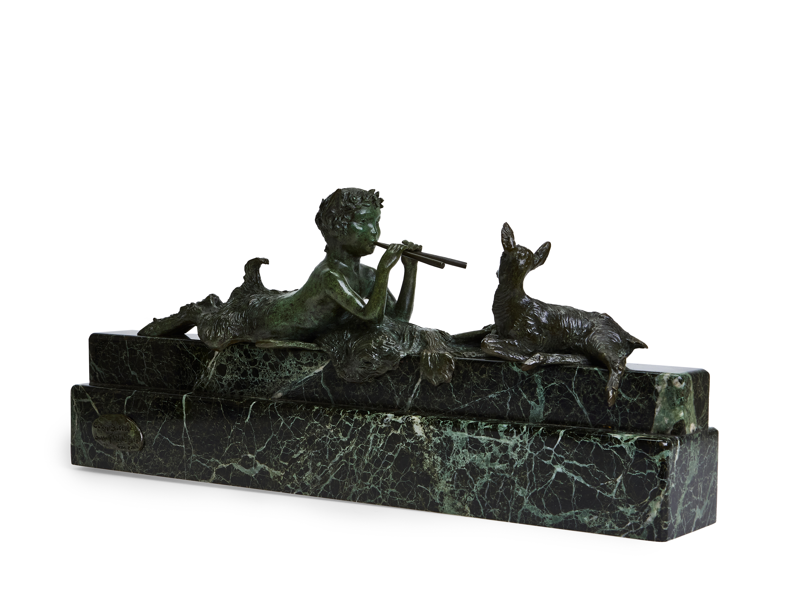 Deze bijzonder verfijnde bronzen sculptuur, ontworpen door Ary-Jean-Léon Bitter (1883–1973), verbeeldt een mythologische faun die, met een laurierkrans op het hoofd, zittend op de grond op twee fluiten speelt. Voor hem ligt een jong geitje in een ontspannen houding, luisterend naar de muziek. De relatie tussen beide figuren straalt een innige tederheid en rust uit. De anatomische precisie, de dynamiek in de plooien van de faun en de natuurlijke houding van het geitje getuigen van een uitzonderlijk artistiek vakmanschap.