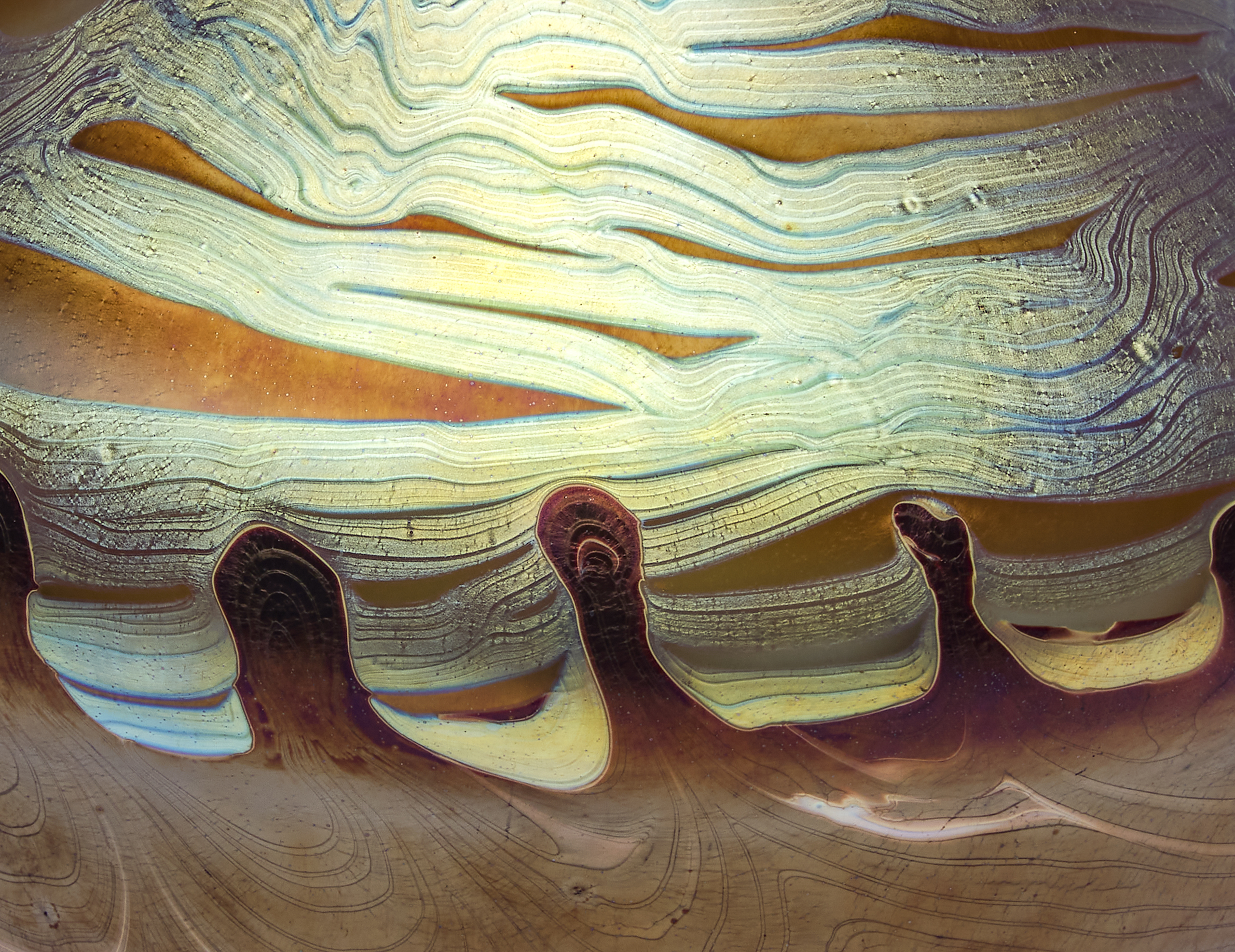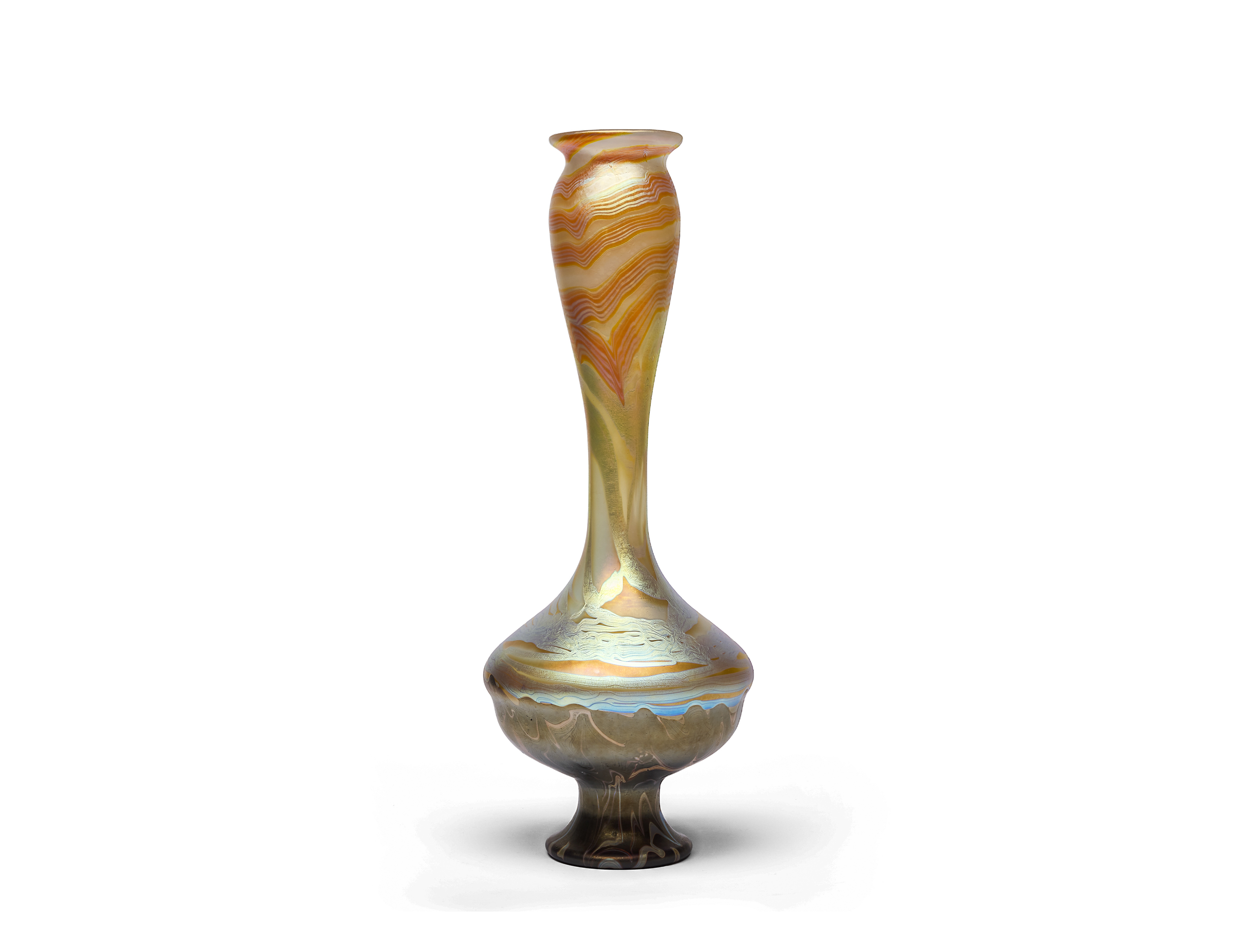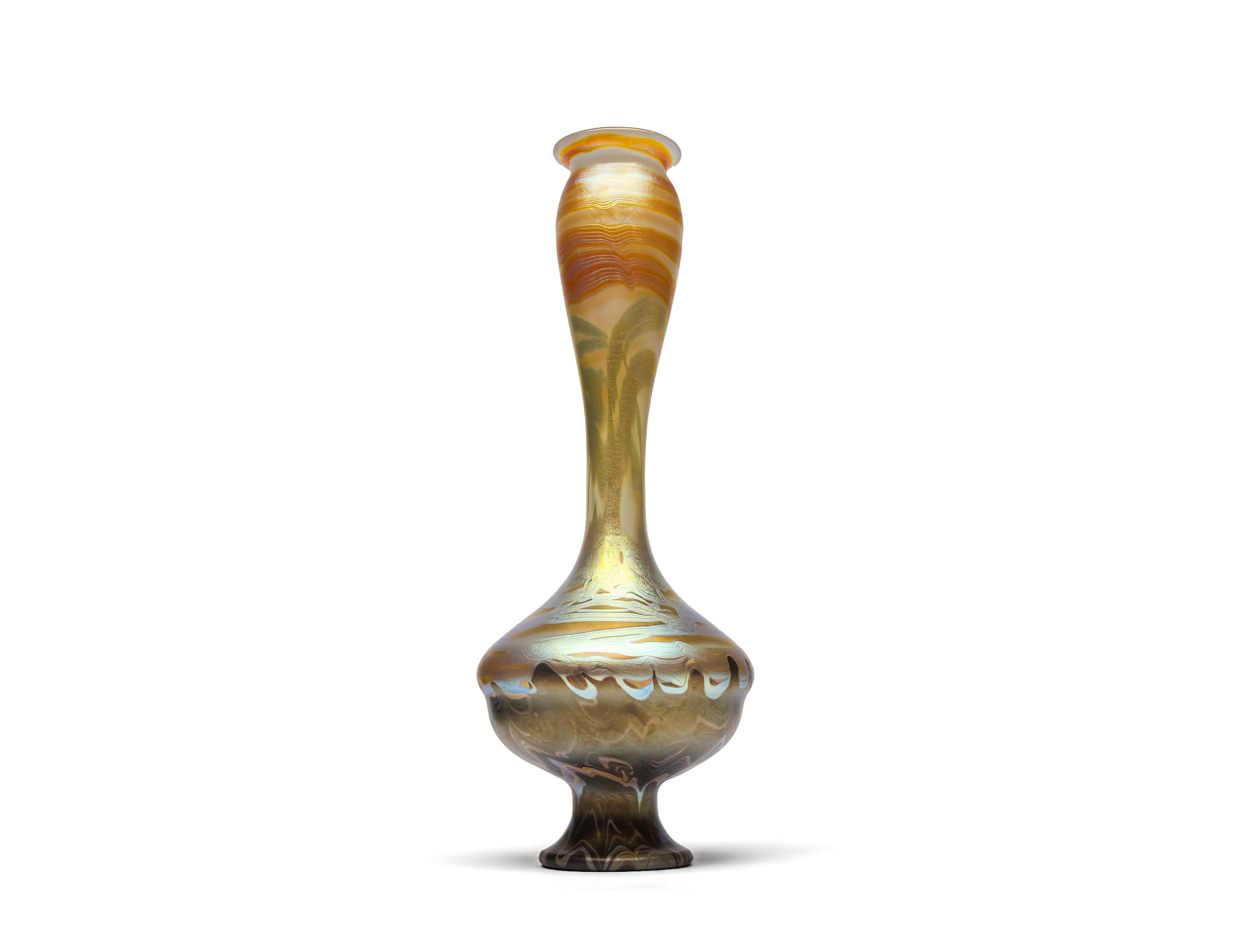 De symbolische kleurcompositie is bijzonder aansprekend. De vaas is opgebouwd vanuit een diep donkerbruine basis, die de aarde verbeeldt. De onderste helft van het lichaam en de langgerekte hals zijn uitgevoerd in warme, goudkleurige tinten die doen denken aan een zonovergoten hemel, terwijl de fijn aangebrachte afgeronde glasdraden in het bovenste gedeelte een gloeiende rode horizon suggereren. Deze poëtische, door de natuur geïnspireerde beeldtaal sluit naadloos aan bij de idealen van de Jugendstil en weerspiegelt de fascinatie van deze periode voor organische vormen en atmosferische landschappen.