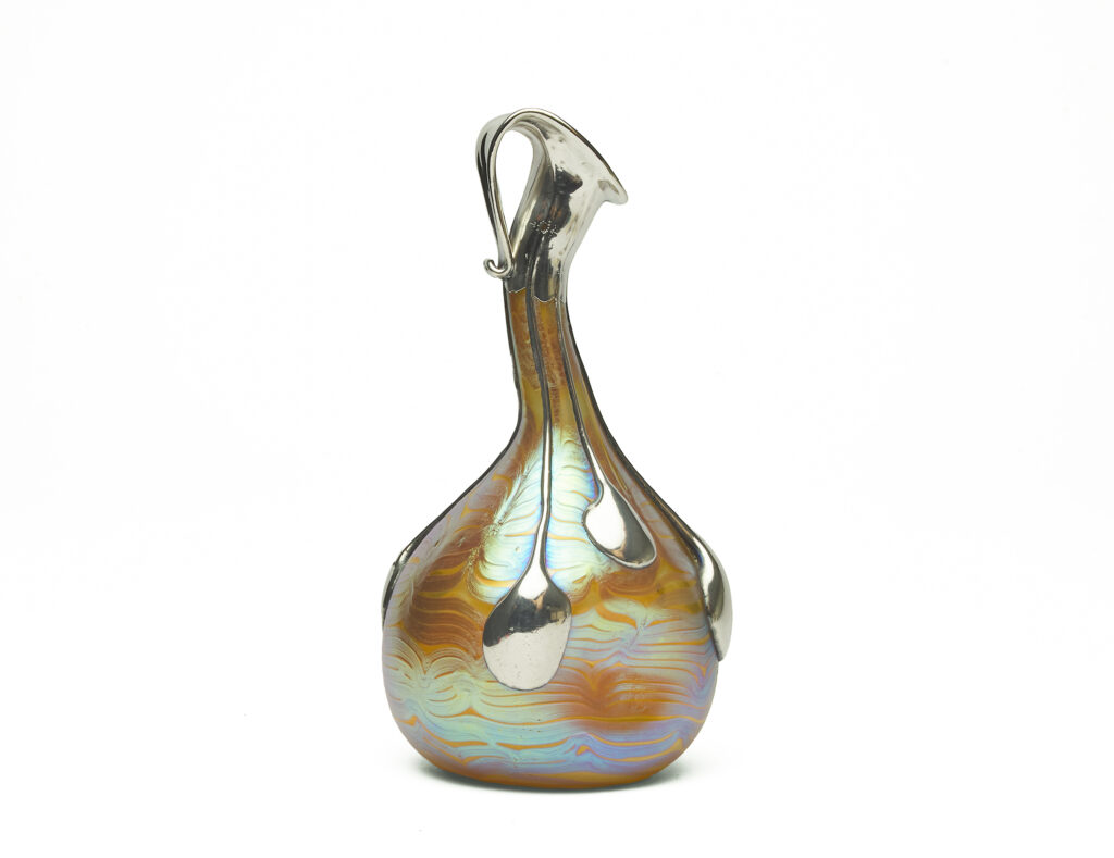 The distinctive form of the rosewater sprinkler has its origins in Middle Eastern vessels used to distribute perfumed water. Around 1900, this historical form was rediscovered and transformed by artists working within the Art Nouveau movement. One of the earliest and most influential interpretations was presented by Louis Comfort Tiffany, who introduced the form into the world of modern artistic glass. Inspired by this innovation, the Loetz glassworks in Klostermühle soon began exploring their own interpretations of the form, integrating it with their highly sophisticated iridescent glass techniques.