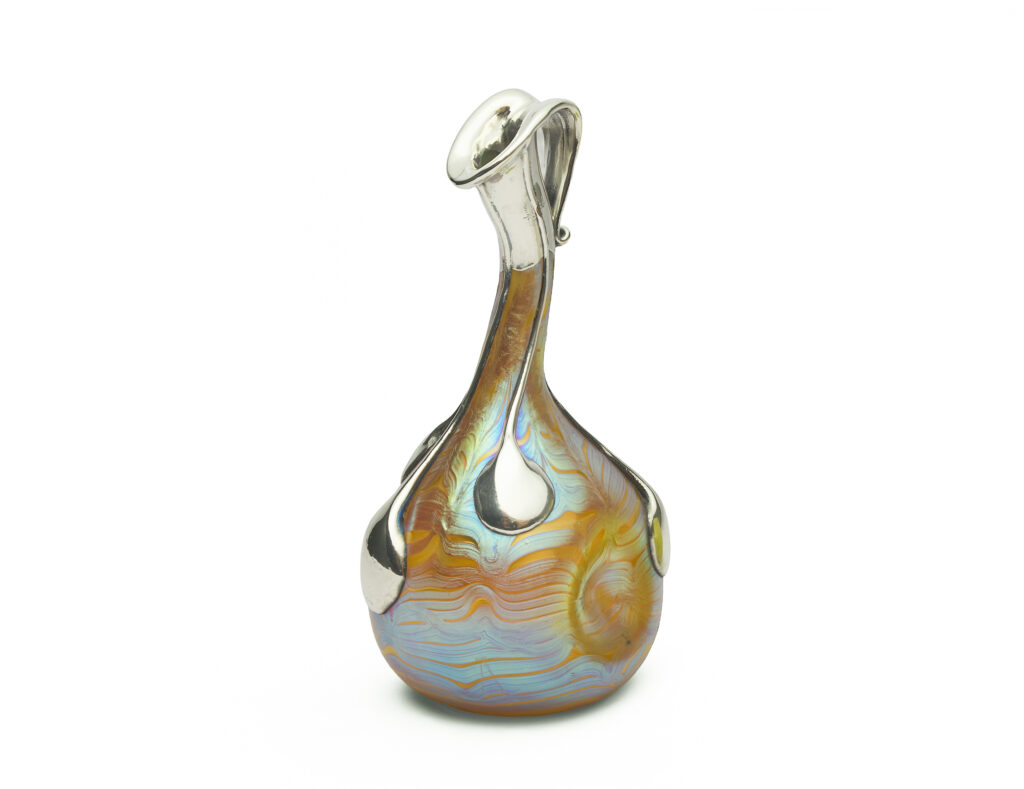 The present example is particularly striking due to its luxurious silver overlay, a technique frequently applied in the United States during the early twentieth century. High-quality Loetz vases were occasionally embellished by skilled silversmiths to further enhance their decorative impact and prestige. The silver overlay accentuates the flowing contours of the vessel and creates a beautiful contrast with the shimmering iridescent glass beneath.